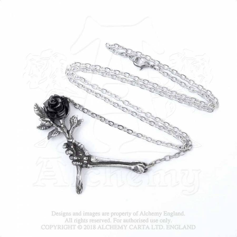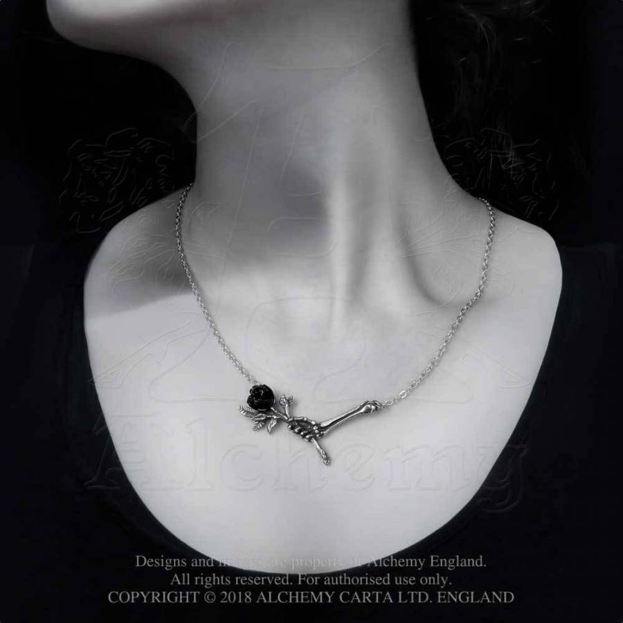 A fine pewter necklace of a skeletal hand offering a single black rose, with a black resin flower and on a split chain, 20″ (51 cm) overall. Sending love from the grave…